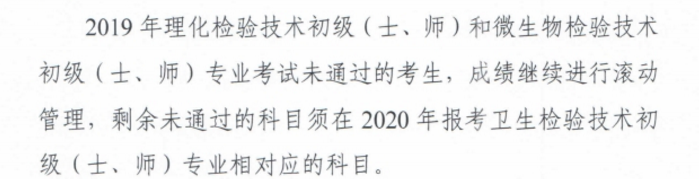 有部分考生是在2019年參加了理化檢驗和微生物檢驗專業(yè)的考試,考試成績繼續(xù)進行滾動管理,剩余未通過的科目須在2020年報考衛(wèi)生檢驗技術初級(士、師)專業(yè)相對應的科目。