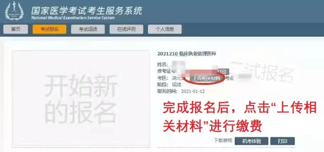 具有二試報(bào)名資格的考生,須在國(guó)家醫(yī)學(xué)考試網(wǎng)(https://www.nmec.org.cn)考生個(gè)人頁(yè)面進(jìn)行國(guó)網(wǎng)預(yù)報(bào)名,并點(diǎn)擊“上傳相關(guān)材料”跳轉(zhuǎn)至“湖北考區(qū)醫(yī)師資格個(gè)人申報(bào)平臺(tái)”進(jìn)行繳費(fèi)(完成繳費(fèi)后可刷新頁(yè)面核實(shí)是否繳費(fèi)成功)。