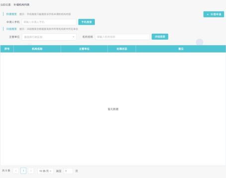 如果查詢(xún)確實(shí)機(jī)構(gòu)不存在機(jī)構(gòu)庫(kù)當(dāng)中,用戶(hù)點(diǎn)擊補(bǔ)增申請(qǐng),閱讀并同意協(xié)議,進(jìn)行信息填報(bào)頁(yè)面,所有項(xiàng)目均為必選項(xiàng),