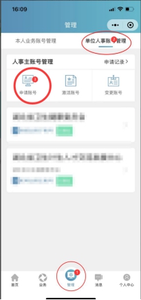 (一)單位主賬號(hào)申請(qǐng):選擇底部“管理”菜單,選擇上方右側(cè)“單位人事賬號(hào)管理”,點(diǎn)擊 “申請(qǐng)賬號(hào)”。