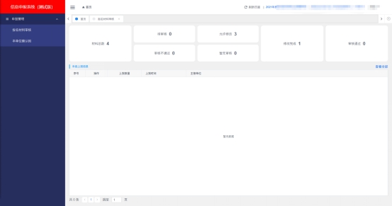 (三)進(jìn)入首頁(yè),右上角顯示用戶(hù)參與的業(yè)務(wù)、單位(賬號(hào)類(lèi)型)以及用戶(hù)姓名,左側(cè)則是菜單,頁(yè)面中心區(qū)域則顯示目前層級(jí)的材料,材料各審核狀態(tài)及數(shù)量。