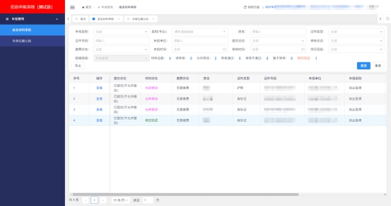 審核條件包括:個(gè)人搜索(姓名、證件類(lèi)型、證件號(hào)碼),申報(bào)搜索( 申報(bào)級(jí)別、申報(bào)類(lèi)別),狀態(tài)搜索(提交狀態(tài)、審核狀態(tài)、繳費(fèi)狀態(tài))以及時(shí)間搜索