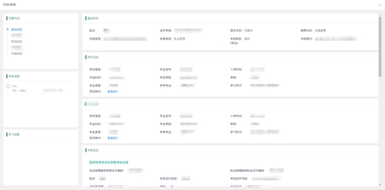 右側(cè)則是個(gè)人填寫(xiě)的信息匯總展示,下方圖片展示了基礎(chǔ)信息、學(xué)歷信息和申報(bào)信息(實(shí)際業(yè)務(wù)申報(bào)內(nèi)容的不同,審核時(shí)內(nèi)容也會(huì)不同),需要根據(jù)不同業(yè)務(wù)不同要求進(jìn)行信息的審核。