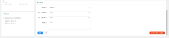 單位在審核結(jié)果選擇審核通過(guò)時(shí),則表示單位審核通過(guò)該人員的實(shí)習(xí)情況,同時(shí)單位也需要對(duì)用戶(hù)的實(shí)習(xí)時(shí)間進(jìn)行選擇確認(rèn)(其他審核狀態(tài)則不需要),在保存之后,用戶(hù)的實(shí)習(xí)進(jìn)度會(huì)保留在左側(cè)的欄目之中,為下個(gè)實(shí)習(xí)單位(如果有)進(jìn)行查看和核驗(yàn)。