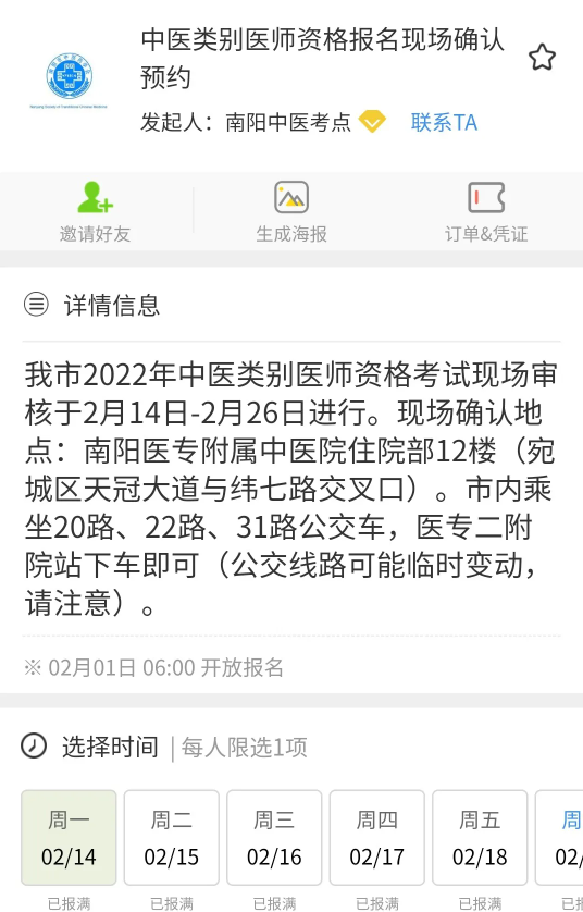 中醫(yī)考生添加南陽(yáng)市中醫(yī)藥學(xué)會(huì)公眾號(hào)現(xiàn)場(chǎng)確認(rèn)預(yù)約。我市2022年中醫(yī)類(lèi)別醫(yī)師資格考試現(xiàn)場(chǎng)審核于2月14日-2月26日進(jìn)行?,F(xiàn)場(chǎng)確認(rèn)地點(diǎn):南陽(yáng)醫(yī)專(zhuān)附屬中醫(yī)院住院部12樓(宛城區(qū)天冠大道與緯七路交叉口)。市內(nèi)乘坐20路、22路、31路公交車(chē),醫(yī)專(zhuān)二附院站下車(chē)即可(公交線路可能臨時(shí)變動(dòng),請(qǐng)注意)。