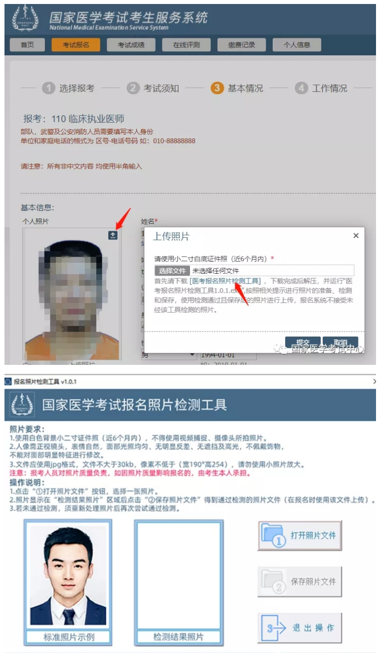 報名上傳照片前須通過“醫(yī)考報名照片檢測工具”(下載地址在上傳照片界面處提示,如下圖)進行檢測處理。檢測過程請嚴格按頁面說明操作,檢測通過后保存,登陸國家醫(yī)學(xué)考試考生服務(wù)系統(tǒng)報名時上傳,報名系統(tǒng)不接受未經(jīng)該工具檢測的照片。請廣大考生提前準備,以免影響考試報名。