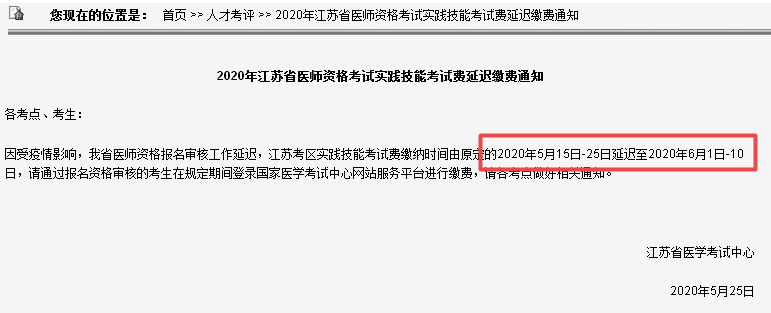 2020臨床執(zhí)業(yè)醫(yī)師考試江蘇技能繳費(fèi)時(shí)間延遲至6月1日-10日