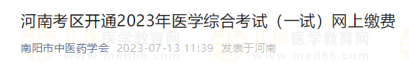 河南南陽考點開通2023年醫(yī)學(xué)綜合考試(一試)網(wǎng)上繳費,參加醫(yī)師醫(yī)學(xué)綜合筆試考試的考生請于2023年7月17日-31日繳納筆試費用,詳細通知詳見下方: