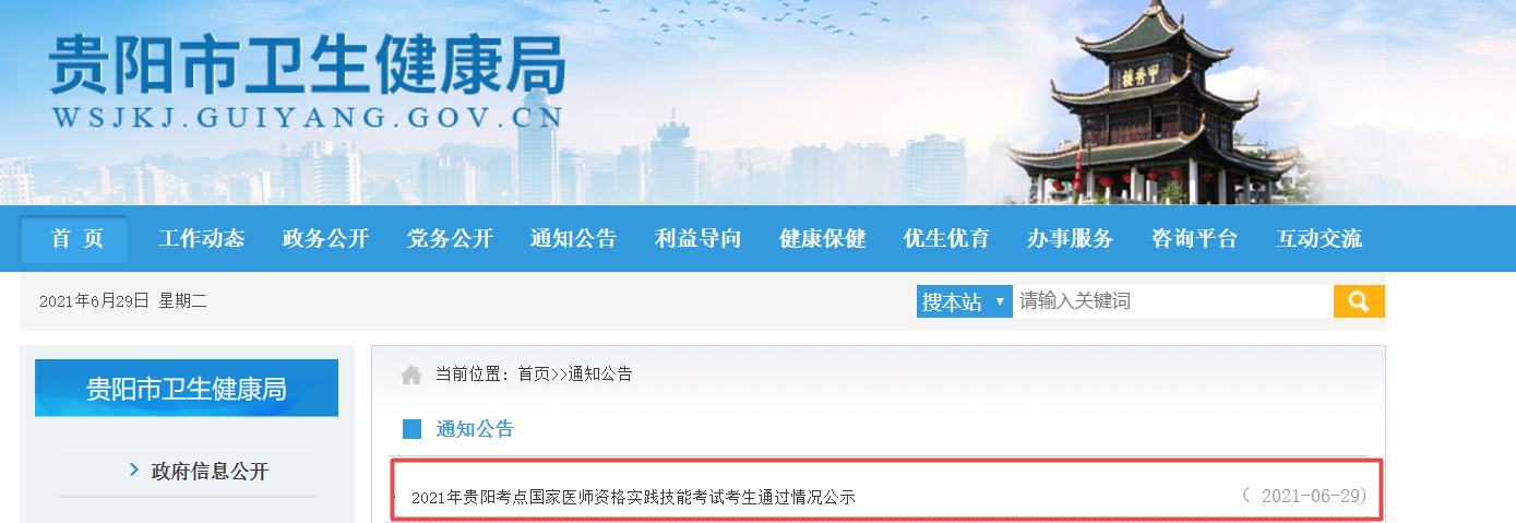 貴陽市2021年臨床執(zhí)業(yè)醫(yī)師實踐技能考試成績已經(jīng)公示
