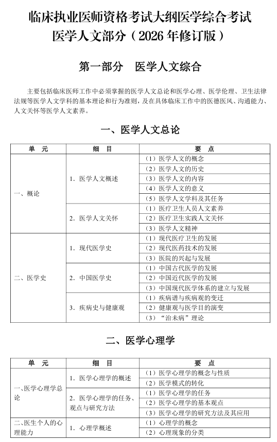 國家衛(wèi)健委官方發(fā)文,2026年臨床執(zhí)業(yè)醫(yī)師考試《醫(yī)學(xué)人文》大綱內(nèi)容有修訂(點擊查看>>)。醫(yī)學(xué)教育網(wǎng)小編專門整理提供【新版】2026年臨床執(zhí)業(yè)醫(yī)師《醫(yī)學(xué)心理學(xué)》考試大綱下載: