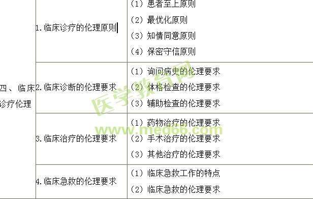 | 2.醫(yī)學(xué)倫理學(xué) | (1)醫(yī)學(xué)倫理學(xué)的概念 (2)醫(yī)學(xué)倫理學(xué)的歷史發(fā)展 (3)醫(yī)學(xué)倫理學(xué)的研究對(duì)象和內(nèi)容 (4)醫(yī)學(xué)倫理學(xué)的基本觀點(diǎn)和學(xué)科屬性 (5)學(xué)習(xí)醫(yī)學(xué)倫理學(xué)的意義和方法 |