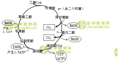 4)考試要點(diǎn):經(jīng)過(guò)一次三羧酸循環(huán),①消耗一分子乙酰CoA;②經(jīng)四次脫氫,二次脫羧,一次底物水平磷酸化。生成1分子FADH2,3分子NADH+H+,2分子CO2,1分子GTP,(一共生成10個(gè)ATP)無(wú)H2O生成;③不可逆步驟(第1、2、3個(gè)步驟)其關(guān)鍵酶有:檸檬【醫(yī)學(xué)教育網(wǎng)原創(chuàng)】酸合酶、異檸檬酸脫氫酶、α-酮戊二酸脫氫酶;④整個(gè)循環(huán)反應(yīng)為不可逆反應(yīng)。