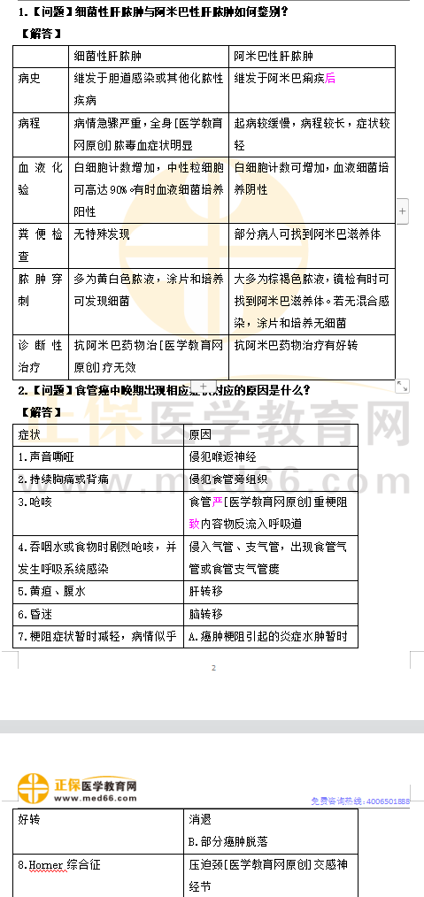 醫(yī)學(xué)教育網(wǎng)臨床執(zhí)業(yè)醫(yī)師:《答疑周刊》2023年第13期已更新,肝膿腫可以分為細菌性肝膿腫和阿米巴肝膿腫,各自特點便于記憶總結(jié)一張表格幫助大家復(fù)習(xí);食管癌出現(xiàn)了嗆咳、聲音嘶啞等的原因是什么,同樣一張表格輕松搞定。