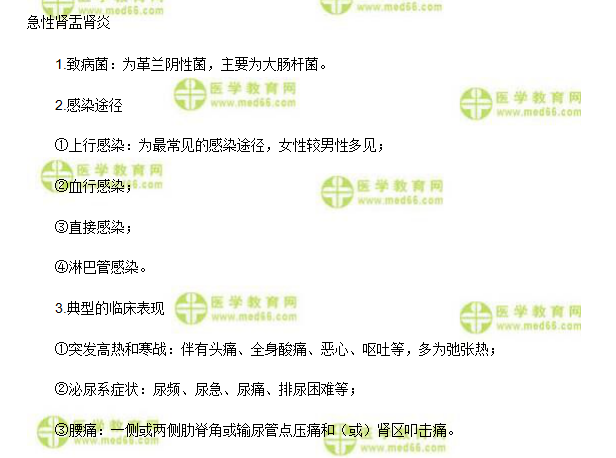 關(guān)于2019年臨床執(zhí)業(yè)醫(yī)泌尿系統(tǒng)中“急性腎盂腎炎”考點(diǎn)相關(guān)內(nèi)容,大家是否有掌握呢?為提高大家備考效率,在此醫(yī)學(xué)教育網(wǎng)小編為大家整理“急性腎盂腎炎”相關(guān)考點(diǎn)與試題。內(nèi)容如下: