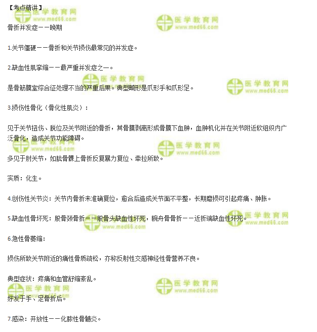 共計10個晚期并發(fā)癥,需要全部記住,醫(yī)學(xué)|教育網(wǎng)記憶要點是與骨折基本已經(jīng)沒有直接關(guān)系,而是一個長期性損傷或者制動導(dǎo)致的損害。與早期并發(fā)癥一樣,分點的內(nèi)容更容易考核,多為A型題。