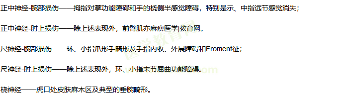 醫(yī)學(xué)|教育網(wǎng)單獨(dú)考核幾率低,一般都是結(jié)合上肢骨折或者脫位進(jìn)行考察,重點(diǎn)掌握各種神經(jīng)損傷的特征性表現(xiàn)即可。