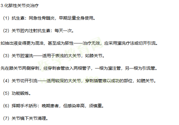 化膿性關(guān)節(jié)炎的診斷依靠關(guān)節(jié)穿刺和關(guān)節(jié)液檢查?;撔?a href="http://www.tymfj.cn/jibing/guanjieyan/" target="_blank" title="關(guān)節(jié)炎" class="hotLink">關(guān)節(jié)炎的治療包括:①早期足量全身使用抗生素;②關(guān)節(jié)腔內(nèi)注射抗生素;③關(guān)節(jié)腔灌洗;④關(guān)節(jié)切開引流;⑤功能鍛煉等。一般青少年和成人,常因關(guān)節(jié)軟骨破壞形成骨性強(qiáng)直,而兒童多發(fā)生骨端的破壞,吸收,引起病理性脫位。出題重點(diǎn)集中在臨床表現(xiàn)、診斷與治療方面,其次是手術(shù)指征。多考核A1和A2型題醫(yī)學(xué)|教育網(wǎng)。