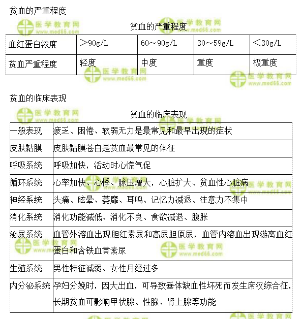 關(guān)于臨床執(zhí)業(yè)醫(yī)師血液系統(tǒng)“貧血的嚴(yán)重程度及臨床表現(xiàn)”相關(guān)考點, 相信參加臨床執(zhí)業(yè)醫(yī)師考試的考生都在學(xué)習(xí),為方便大家記憶,在此醫(yī)學(xué)教育網(wǎng)小編為大家整理內(nèi)容如下: