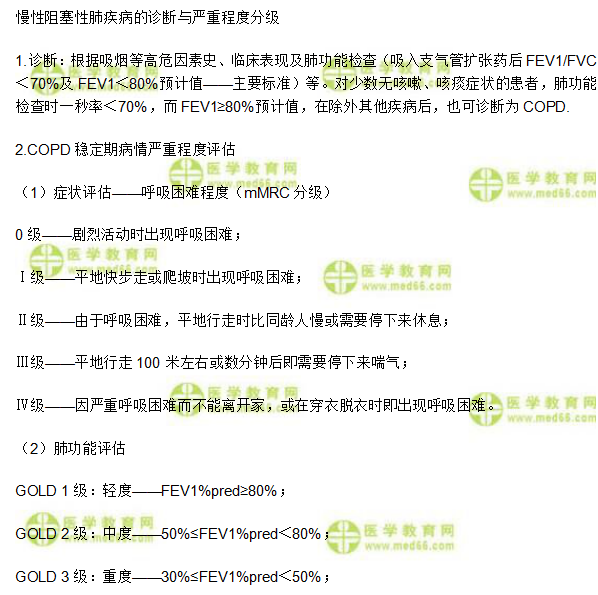 關(guān)于臨床執(zhí)業(yè)醫(yī)師《呼吸系統(tǒng)》:慢性阻塞性肺疾病的診斷與嚴(yán)重程度分級(jí),相關(guān)考點(diǎn),相信備考2020年臨床執(zhí)業(yè)醫(yī)師考試的考生都在關(guān)注,為方便大家學(xué)習(xí),在此醫(yī)學(xué)教育網(wǎng)小編為大家整理如下內(nèi)容: