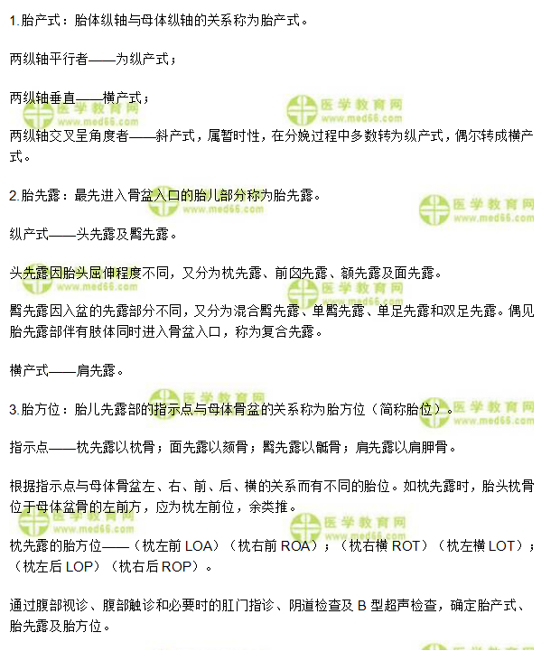 針對臨床執(zhí)業(yè)醫(yī)師女性生殖系統(tǒng)中“胎產(chǎn)式、胎先露、胎方位”相關(guān)考點,相信大家都在認(rèn)真學(xué)習(xí),為提高備考效率,在此醫(yī)學(xué)教育網(wǎng)小編為大家整理如下內(nèi)容: