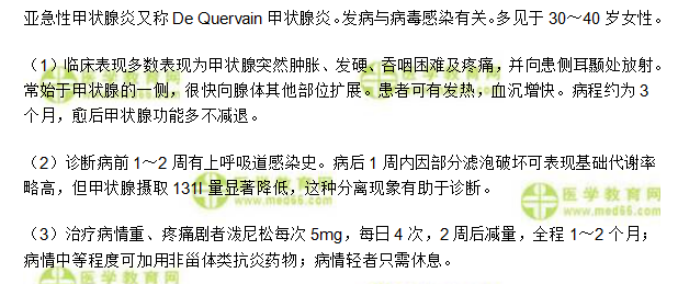 關(guān)于“臨床執(zhí)業(yè)《代謝、內(nèi)分泌系統(tǒng)》考點(diǎn):亞急性甲狀腺炎”相關(guān)內(nèi)容,相信報(bào)考臨床執(zhí)業(yè)醫(yī)師考試的考生都在學(xué)習(xí),為提高大家備考效率,在此醫(yī)學(xué)教育 網(wǎng)小編為大家整理如下內(nèi)容: