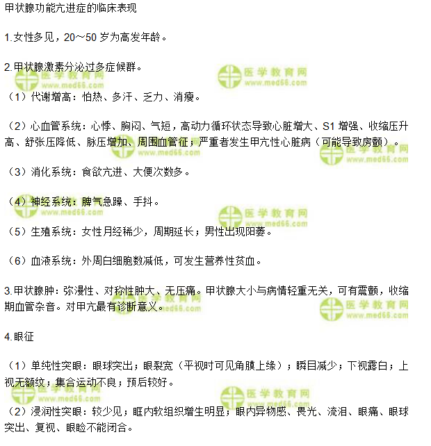 關(guān)于“臨床執(zhí)業(yè)《代謝、內(nèi)分泌系統(tǒng)》考點(diǎn):甲狀腺功能亢進(jìn)癥的臨床表現(xiàn)”相關(guān)內(nèi)容,相信報(bào)考臨床執(zhí)業(yè)醫(yī)師考試的考生都在學(xué)習(xí),為提高大家備考效率,在此醫(yī)學(xué)教育 網(wǎng)小編為大家整理如下內(nèi)容: