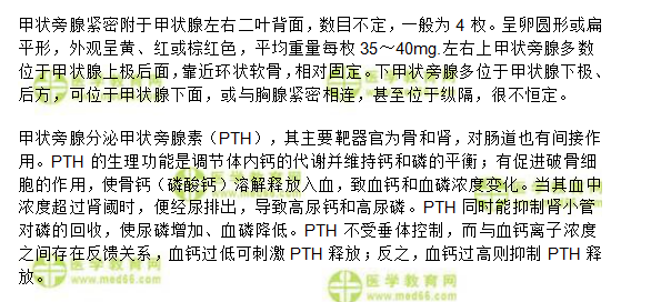 關(guān)于“臨床執(zhí)業(yè)醫(yī)師《代謝、內(nèi)分泌系統(tǒng)》考點(diǎn):甲狀旁腺疾病”相關(guān)內(nèi)容,相信參加臨床執(zhí)業(yè)醫(yī)師考試的考生都在關(guān)注, 為方便大家學(xué)習(xí),在此醫(yī)學(xué)教育網(wǎng)小編為大家整理如下內(nèi)容: