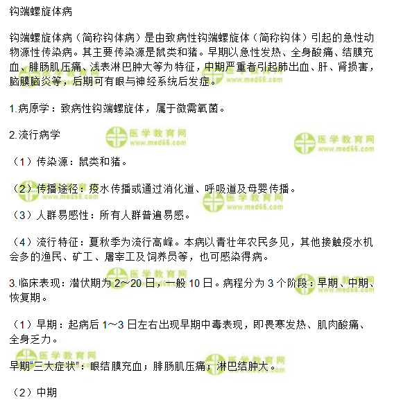 關(guān)于“臨床執(zhí)業(yè)《傳染病、性傳播疾病》考點(diǎn):鉤端螺旋體病”相關(guān)內(nèi)容,相信參加臨床執(zhí)業(yè)醫(yī)師考試的考生都想了解,為方便大家備考,在此醫(yī)學(xué)教育網(wǎng)小編為大家整理如下內(nèi)容: