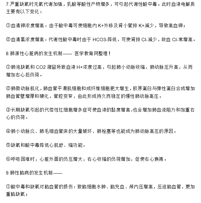 6.Ⅰ型和Ⅱ型呼吸衰竭時(shí)均有低氧血癥,因此均可引起代謝性酸中毒;Ⅱ型呼吸衰竭時(shí)低氧血癥和高碳酸血癥并存,因此可有代謝性酸中毒和呼吸性酸中毒。