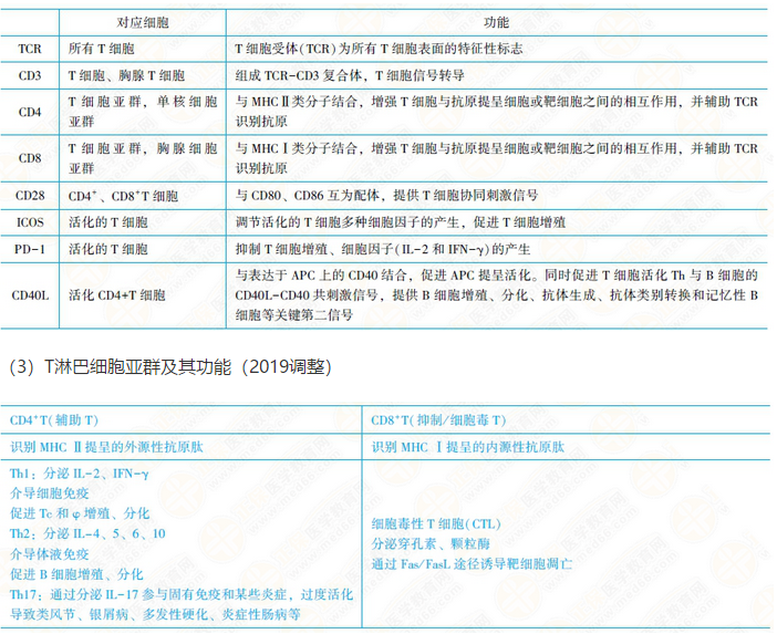(2)TCR-CD3復(fù)合物;根據(jù)是否表達(dá)CD4或CD8分子可以分為CD4+T細(xì)胞和CD8+T細(xì)胞。CD4+T細(xì)胞:受MHCⅡ類分子限制;CD8+T細(xì)胞:受MHCⅠ類分子限制。(2019調(diào)整)