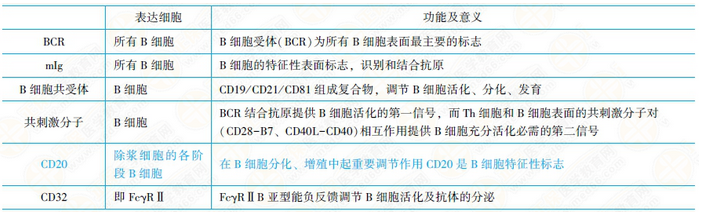 (2)CD19和CD20分子是人B細(xì)胞特有的表面標(biāo)志,存在于前B細(xì)胞、未成熟B細(xì)胞和成熟B細(xì)胞表面,其主要功能是調(diào)節(jié)B細(xì)胞發(fā)育。(2019調(diào)整)