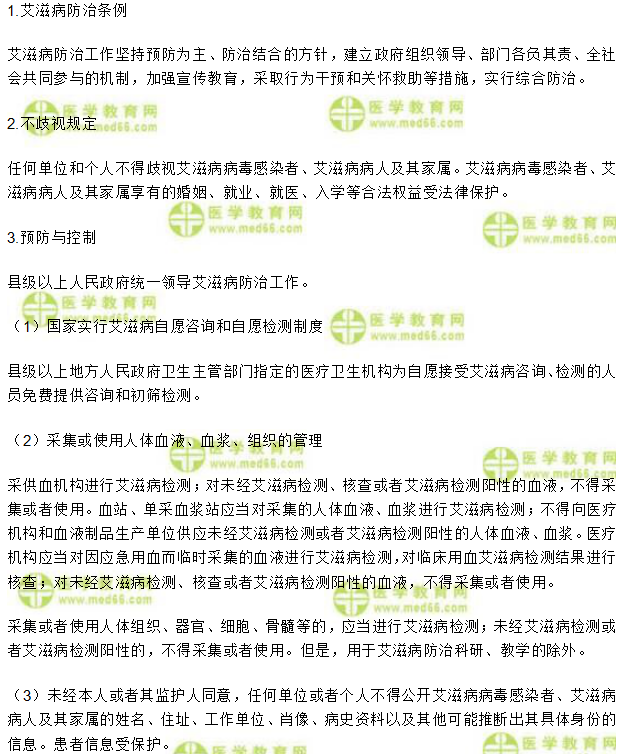 關(guān)于“臨床執(zhí)業(yè)衛(wèi)生法規(guī)考點(diǎn):艾滋病防治條例”相關(guān)內(nèi)容,相信參加臨床執(zhí)業(yè)醫(yī)師考試的考生都在關(guān)注,為方便大家了解,在此醫(yī)學(xué)教育網(wǎng)小編為大家整理如下內(nèi)容: