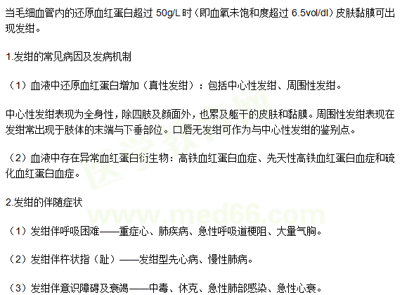 關(guān)于“臨床執(zhí)業(yè)醫(yī)師《實(shí)踐綜合》考點(diǎn)—發(fā)紺的常見病因及發(fā)病機(jī)制”相關(guān)內(nèi)容,相信參加臨床執(zhí)業(yè)醫(yī)師考試的考生都在關(guān)注,為方便大家了解,在此醫(yī)學(xué)教育網(wǎng)小編為大家整理如下內(nèi)容: