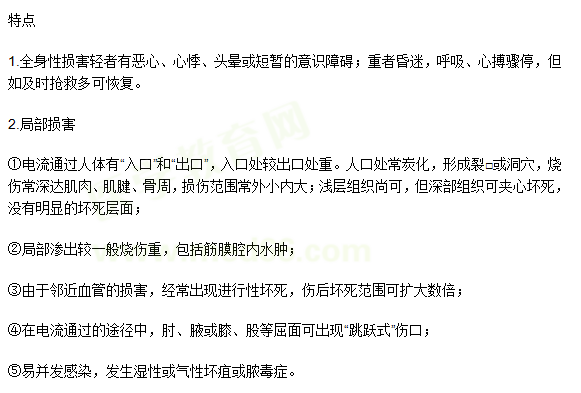關于“臨床執(zhí)業(yè)醫(yī)師“其他”考點:電燒傷的特點和急救措施”相關內(nèi)容,相信參加臨床執(zhí)業(yè)醫(yī)師考試的考生都在關注,為方便大家了解,在此醫(yī)學教育網(wǎng)小編為大家整理如下內(nèi)容: