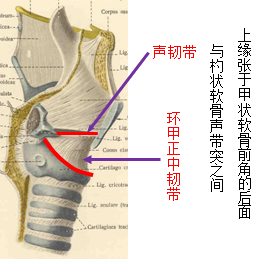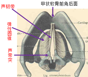 起自甲狀軟骨前角后面的圓錐形彈性纖維膜,止于杓狀軟骨聲帶和環(huán)狀軟骨上緣。