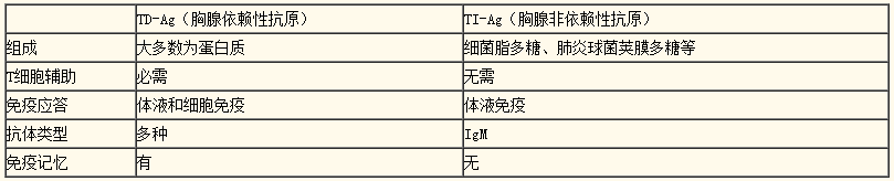 胸腺非依賴性抗原(TI-Ag):直接刺激B細胞,無需T細胞輔助,能產生IgM類抗體,無免疫記憶