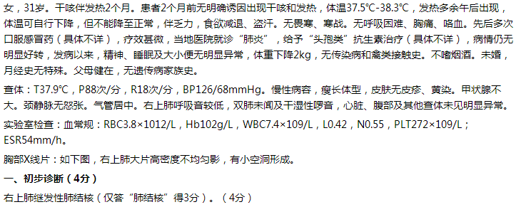 1.青年女性。咳嗽、午后低熱,常規(guī)抗菌藥物治療無效。近期體重下降。(1.5分)