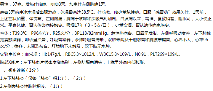 ①左側(cè)肺炎,伴胸痛(胸膜性胸痛)。(1分)