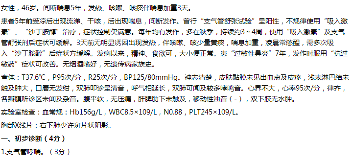 ②反復(fù)發(fā)作性喘息,有時(shí)凌晨發(fā)作,呈季節(jié)性,激素及支氣管舒張劑治療有效。(1分)