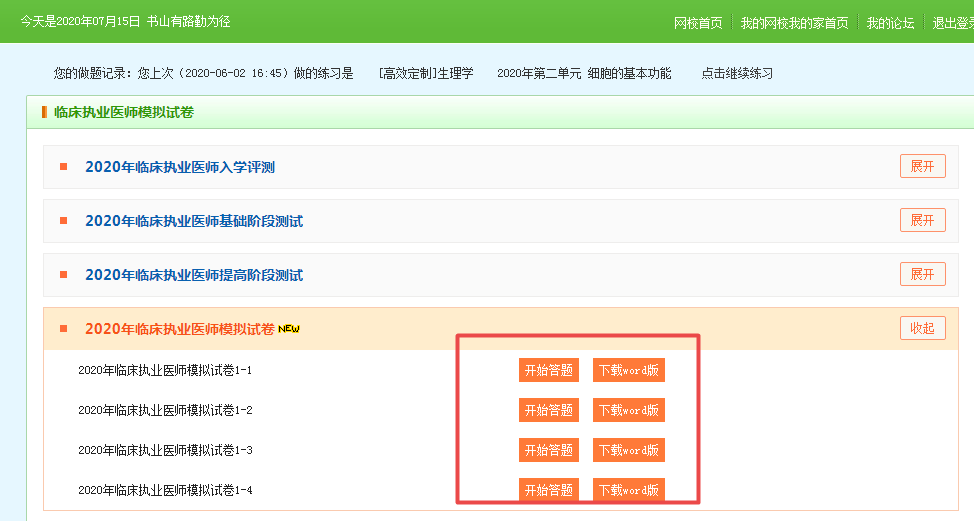 醫(yī)學(xué)教育網(wǎng)2020年臨床執(zhí)業(yè)醫(yī)師面授旗艦班、vip簽約特訓(xùn)營(yíng)、私教取證班、高效定制班、無(wú)憂實(shí)驗(yàn)班、超值精品班、沖刺**班、特色暢學(xué)班的考生注意,網(wǎng)校第一套模擬試卷已經(jīng)于7月13日正式開(kāi)通,快來(lái)登錄我的網(wǎng)校我的家學(xué)習(xí)吧!