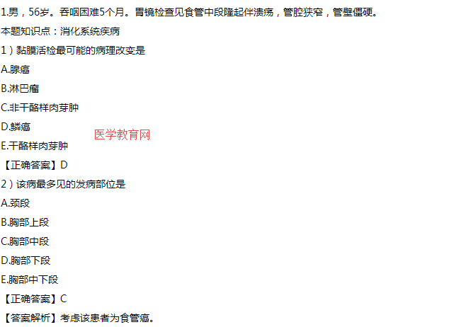 (1)鱗狀細(xì)胞癌:此型食管癌最為多見,約占90%,根據(jù)分化程度又可分為高、中、低分化三級。