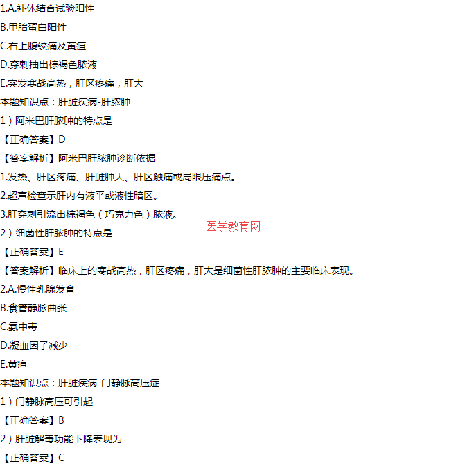 【答案解析】門(mén)靜脈高壓導(dǎo)致門(mén)體側(cè)支循環(huán)開(kāi)放:①食管胃底靜脈曲張;②腹壁靜脈曲張;③痔靜脈擴(kuò)張;④腹膜后吻合支曲張;⑤脾腎分流。肝硬化時(shí),肝臟將氨合成尿素能力下降,并使血氨升高,引起肝性腦病。雌激素主要在肝臟滅活,肝硬化時(shí)雌激素滅活能力減低,致雌激素在體內(nèi)增多,出現(xiàn)乳房發(fā)育。