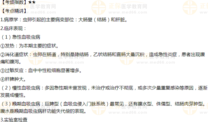 2.急性血吸蟲(chóng)病的臨床表現(xiàn):發(fā)熱、胃腸道癥狀、肝脾腫大、肺部癥狀。