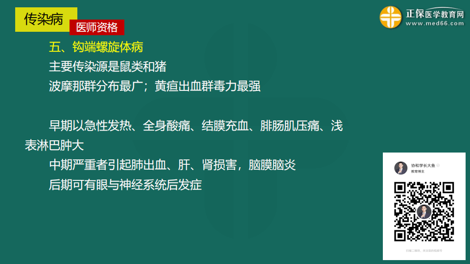 臨床執(zhí)業(yè)醫(yī)師考試“鉤端螺旋體病——臨床執(zhí)業(yè)醫(yī)師二試傳染病考試資料”想必大家都比較關(guān)注,醫(yī)學(xué)教育網(wǎng)編輯整理臨床醫(yī)師考前一小時(shí)直播課部分講義內(nèi)容如下,希望可以幫助到二試地區(qū)考生!