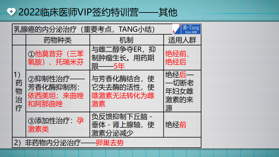 乳腺癌的內(nèi)分泌治療(重要考點(diǎn),TANG小結(jié))如下,湯以恒老師4月26日開展了VIP強(qiáng)化特訓(xùn)公開課,參與直播的同學(xué)熱情高漲,都是干貨,全是精髓! 錯(cuò)過直播的同學(xué)可以看直播回放>>,現(xiàn)在將精彩講義內(nèi)容摘取如下,沒有參加直播的同學(xué),也可以一睹為快啦!