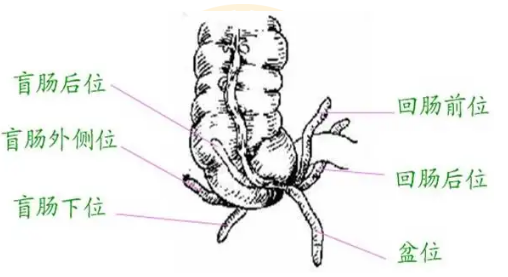 闌尾的解剖位置以其根部為中心,可以如時(shí)針樣出現(xiàn)在360°范圍內(nèi)的任何位置。尋找闌尾的位置不僅利于手術(shù)的開展,還決定了病人臨床癥狀及壓痛部位的不同。