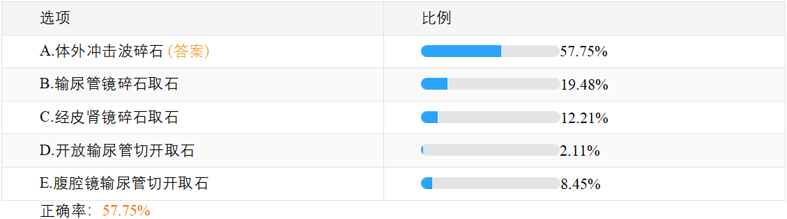 關于“男,35歲。B超發(fā)現(xiàn)右輸尿管上段結石,大小1.2cm×0.8cm,合并輕度右腎積水... ...”,相信很多正在備戰(zhàn)2023年臨床執(zhí)業(yè)醫(yī)師考試的考生十分關注,此題在摸底測試50題(點擊參加測試>>)中正確率僅為57.75%,建議大家及時復習,牢固掌握相關知識點!