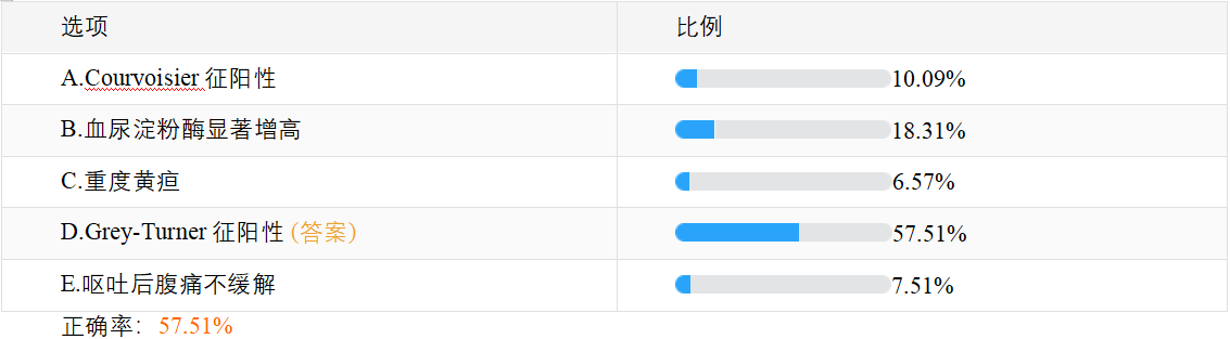 關(guān)于“臨床執(zhí)業(yè)醫(yī)師筆試摸底測(cè)試題:提示急性出血壞死性胰腺炎的臨床表現(xiàn)為?”,相信很多正在備戰(zhàn)2023年臨床執(zhí)業(yè)醫(yī)師考試的考生十分關(guān)注,此題在摸底測(cè)試50題(點(diǎn)擊參加測(cè)試>>)中正確率僅為57.51%,建議大家及時(shí)復(fù)習(xí),牢固掌握相關(guān)知識(shí)點(diǎn)!