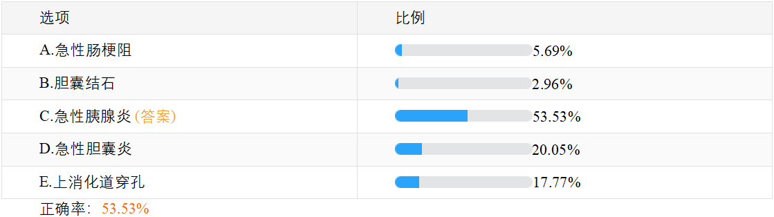 關(guān)于“男,22歲。大量飲酒后突發(fā)上腹部脹痛,伴惡心、嘔吐2小時......”的相關(guān)內(nèi)容,相信很多正在備戰(zhàn)2023年臨床執(zhí)業(yè)醫(yī)師考試的考生十分關(guān)注,此題在摸底測試50題(點擊參加測試>>)中正確率僅為53.53%,建議大家及時復習,牢固掌握相關(guān)知識點!