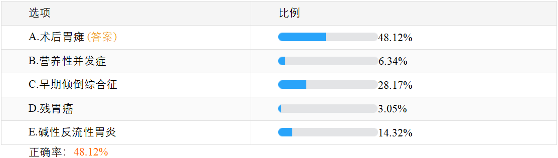 關于“【A1型題】屬于胃大部切除術后早期并發(fā)癥的是?”,相信很多正在備戰(zhàn)2023年臨床執(zhí)業(yè)醫(yī)師考試的考生十分關注,此題在摸底測試50題(點擊參加測試>>)中正確率僅為48.12%,建議大家及時復習,牢固掌握相關知識點!